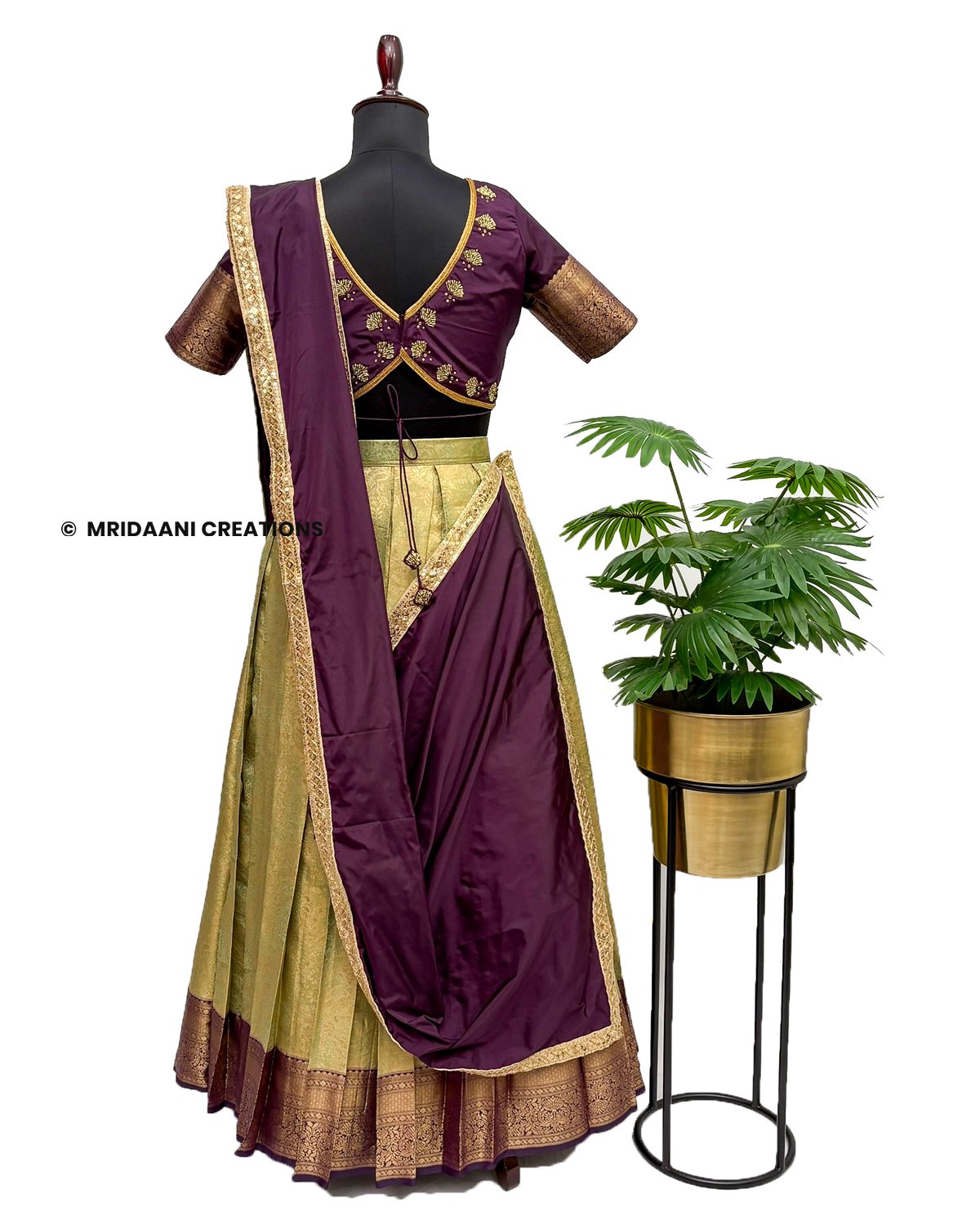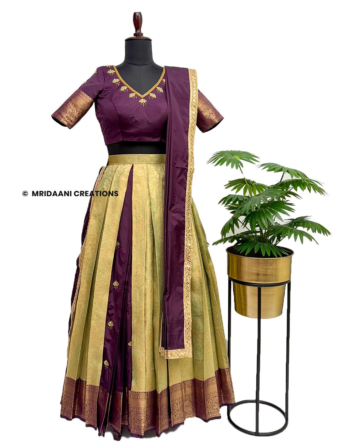 Mridaani designs this mesmerizing ethnic lehenga crafted in Kancheepuram Tissue Silk Material with delicate hand embroidery in various patterns, teaming it with matching blouse & a Dupatta.