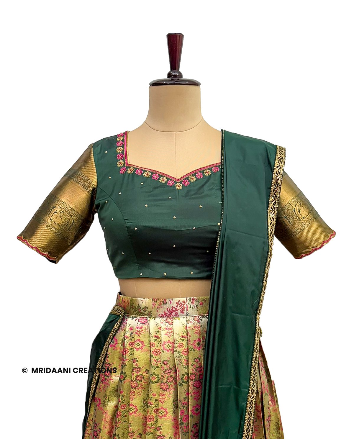 Mridaani designs this mesmerizing ethnic lehenga crafted in Kancheepuram Tissue Silk Material with delicate hand embroidery in various patterns, teaming it with matching blouse & a Dupatta.