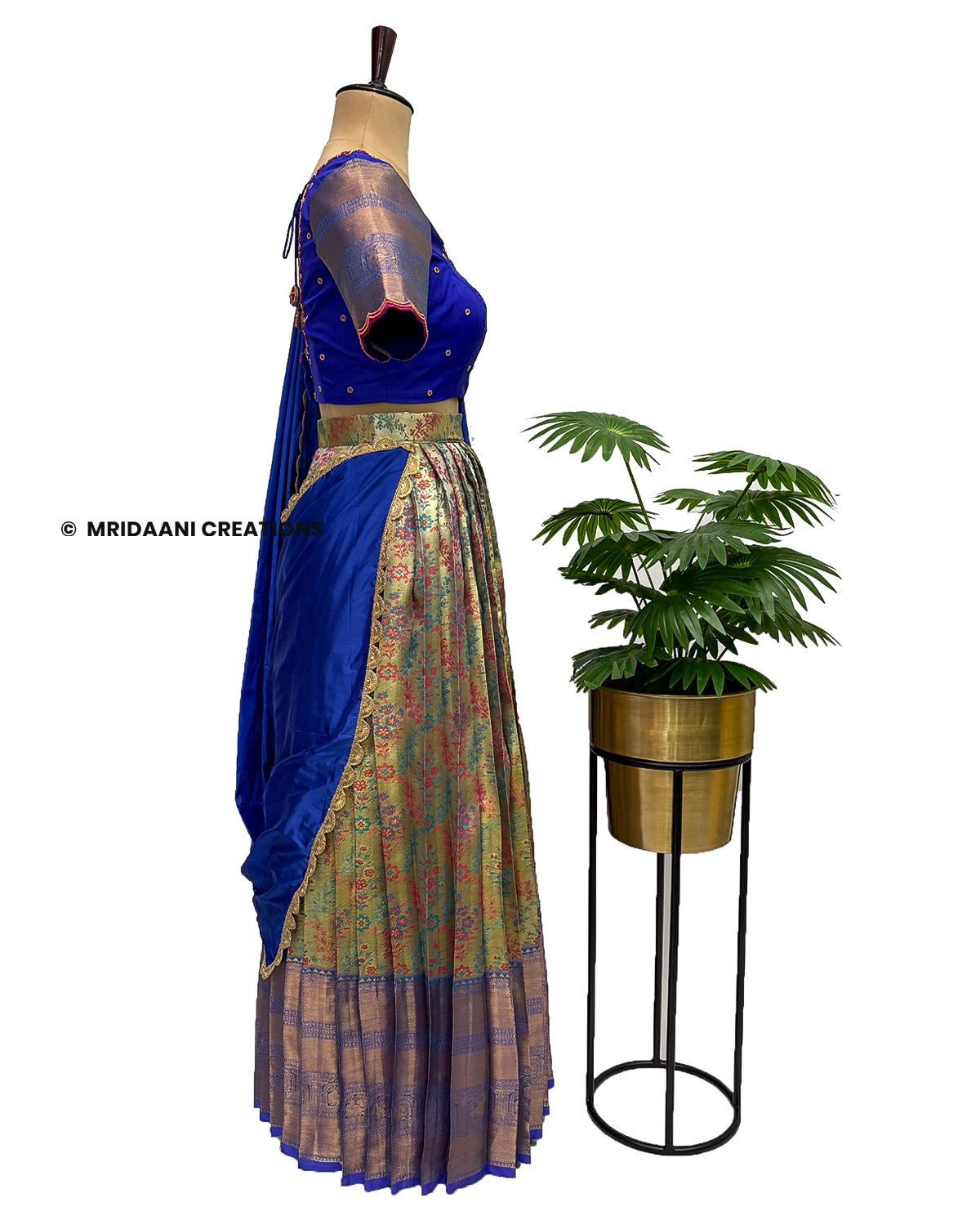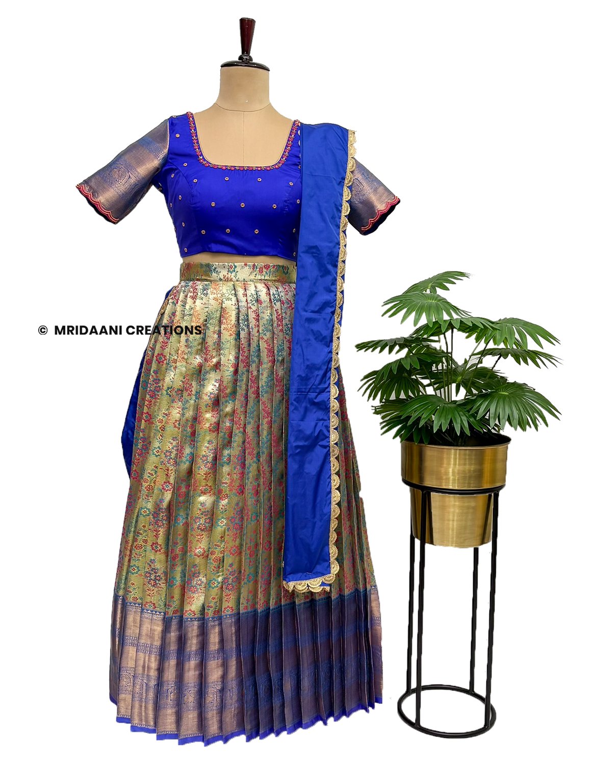 Mridaani designs this mesmerizing ethnic lehenga crafted in Kancheepuram Tissue Silk Material with delicate hand embroidery in various patterns, teaming it with matching blouse & a Dupatta.