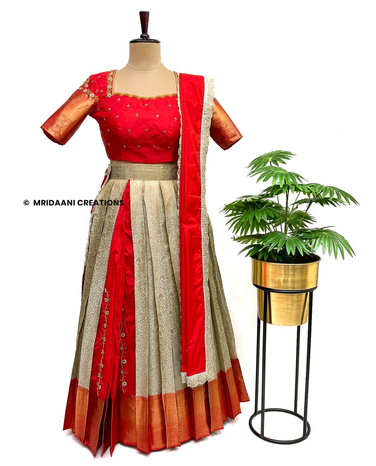 Mridaani designs this mesmerizing ethnic lehenga crafted in Kancheepuram Tissue Silk Material with delicate hand embroidery in various patterns, teaming it with matching blouse & a Dupatta.