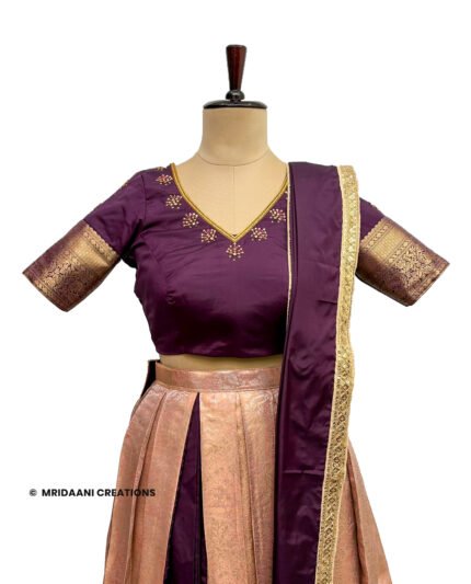 Mridaani designs this mesmerizing ethnic lehenga crafted in Kancheepuram Tissue Silk Material with delicate hand embroidery in various patterns, teaming it with matching blouse & a Dupatta.