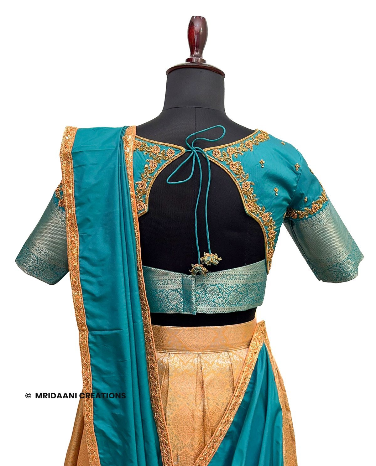 Mridaani designs this mesmerizing ethnic lehenga crafted in Kancheepuram Tissue Silk Material with delicate hand embroidery in various patterns, teaming it with matching blouse & a Dupatta.