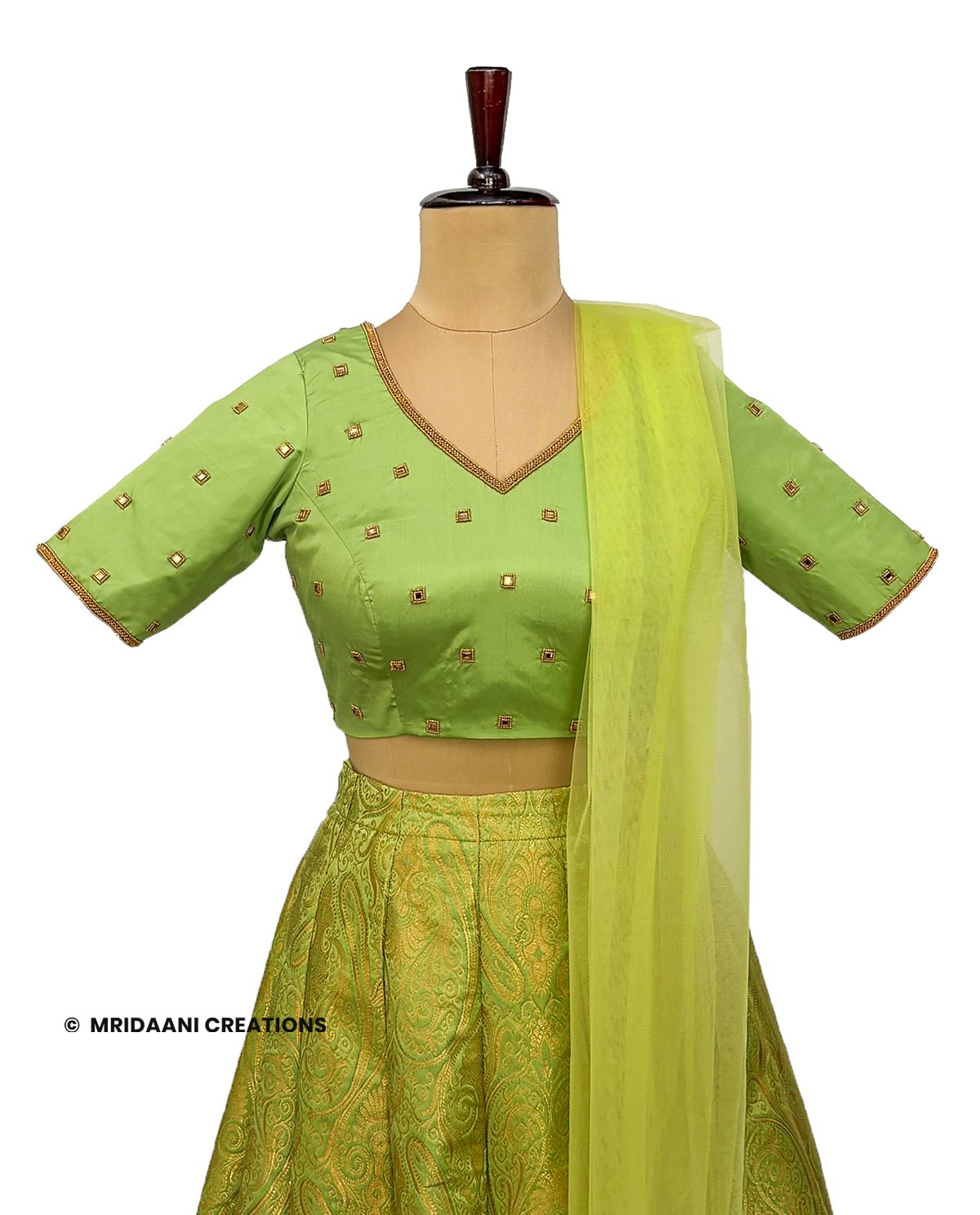 Mridaani designs this mesmerizing ethnic lehenga crafted in Banarasi Brocade and Silk Material with Hand Embroidery, teaming it with matching blouse & a Dupatta.