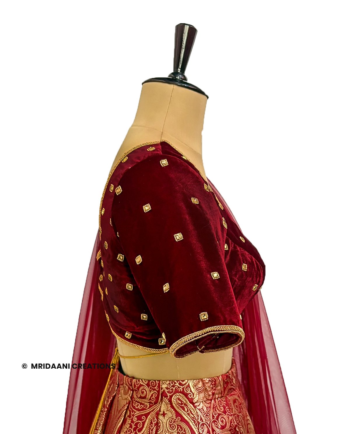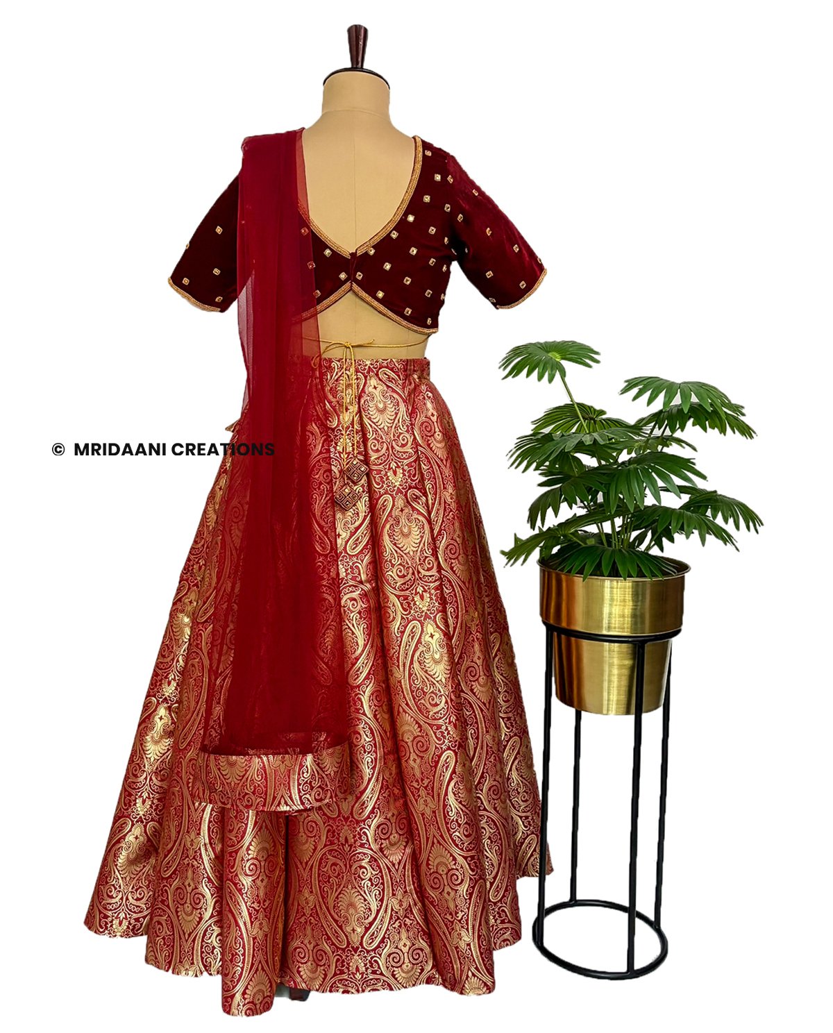 Mridaani designs this mesmerizing ethnic lehenga crafted in Banarasi Brocade and Silk Material with Hand Embroidery, teaming it with matching blouse & a Dupatta.