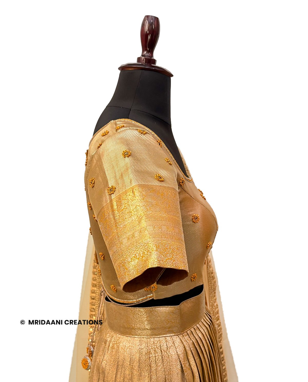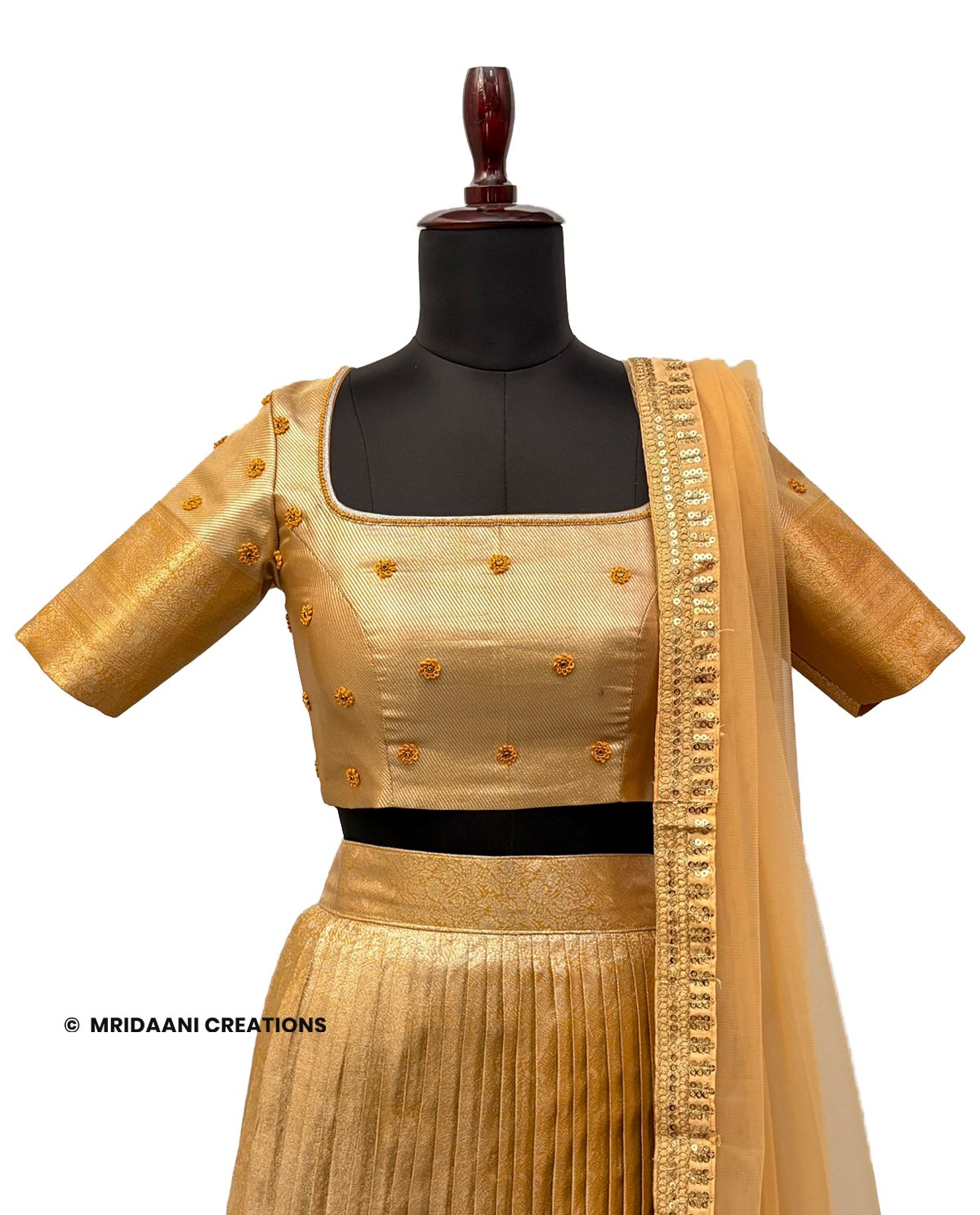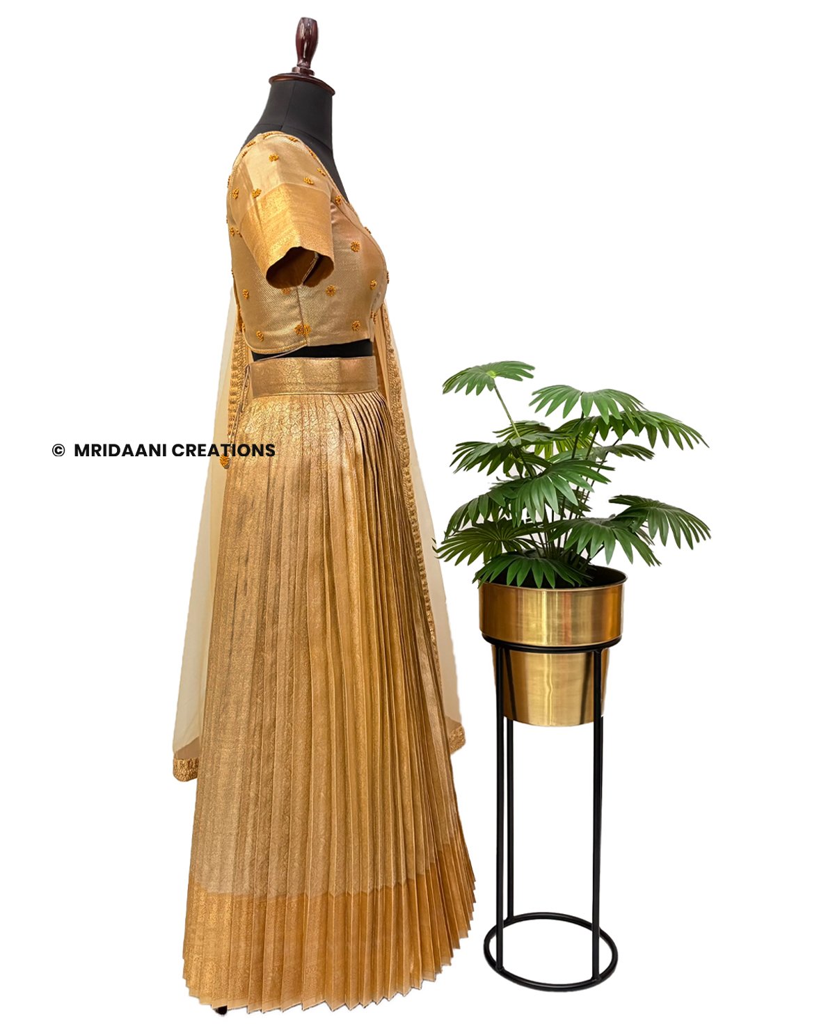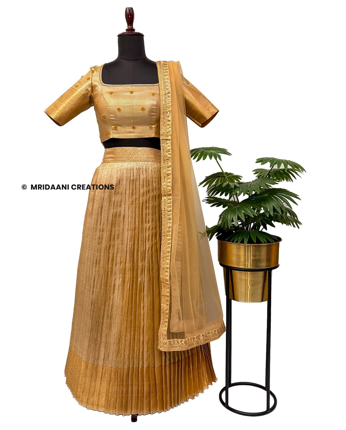 Mridaani designs this mesmerizing ethnic lehenga crafted in Kancheepuram Tissue Silk Material with delicate hand embroidery in various patterns, teaming it with matching blouse & a Dupatta.