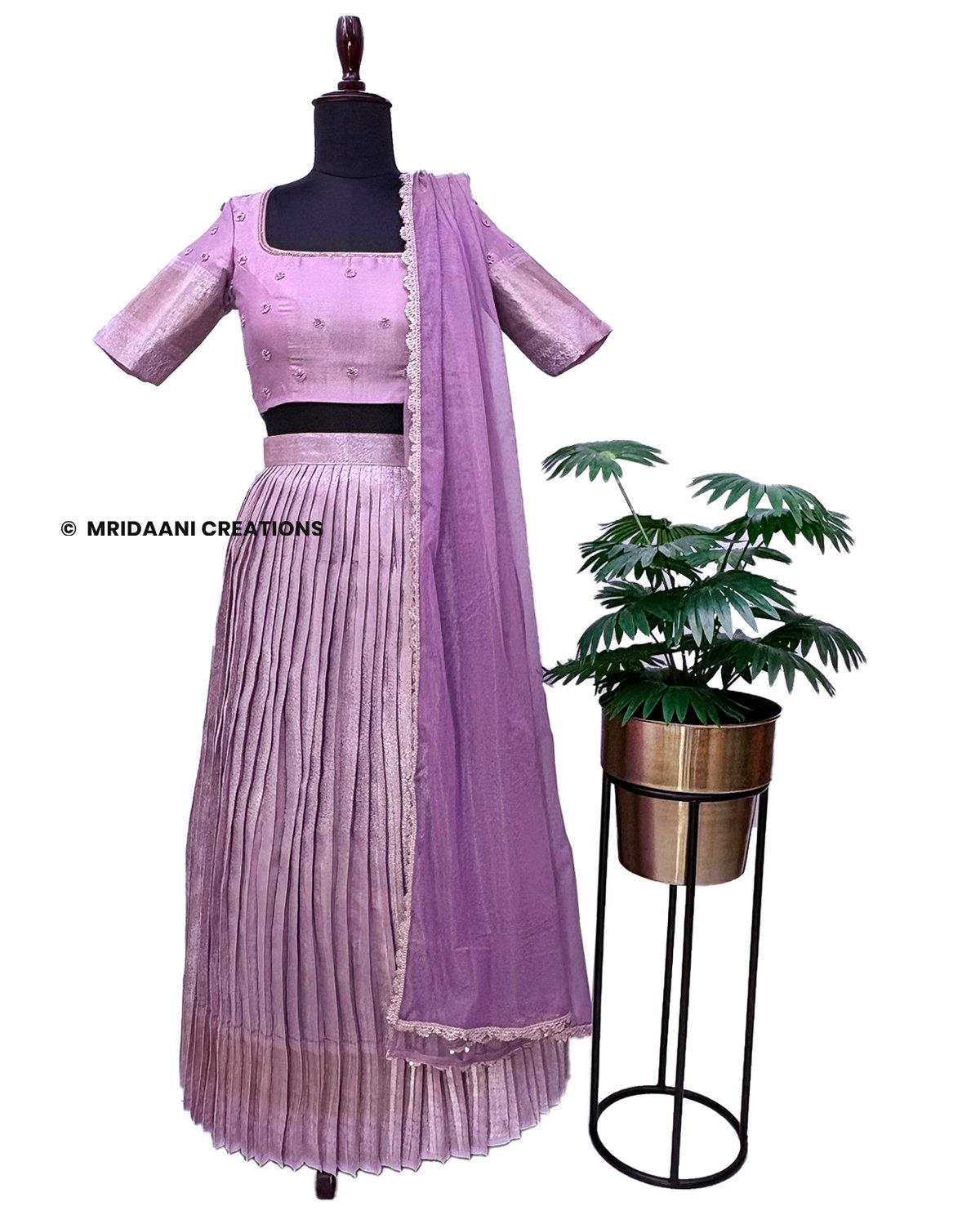 Mridaani designs this mesmerizing ethnic lehenga crafted in Kancheepuram Tissue Silk Material with delicate hand embroidery in various patterns, teaming it with matching blouse & a Dupatta.