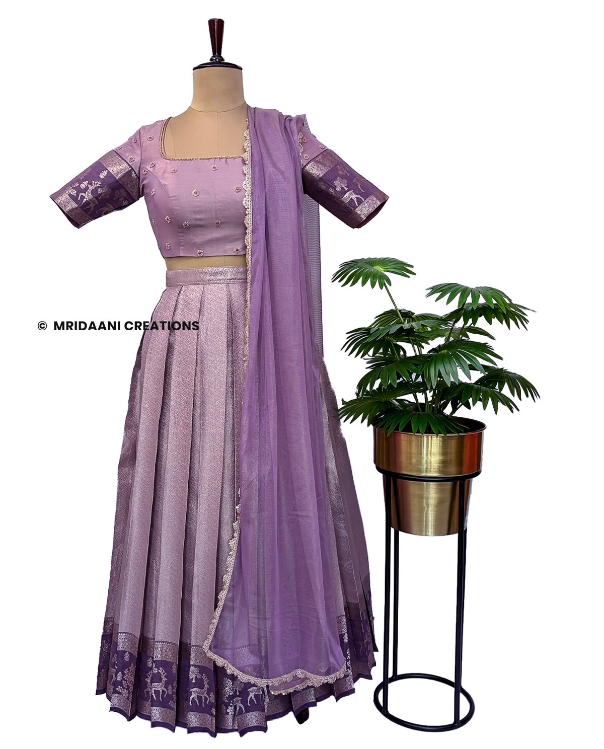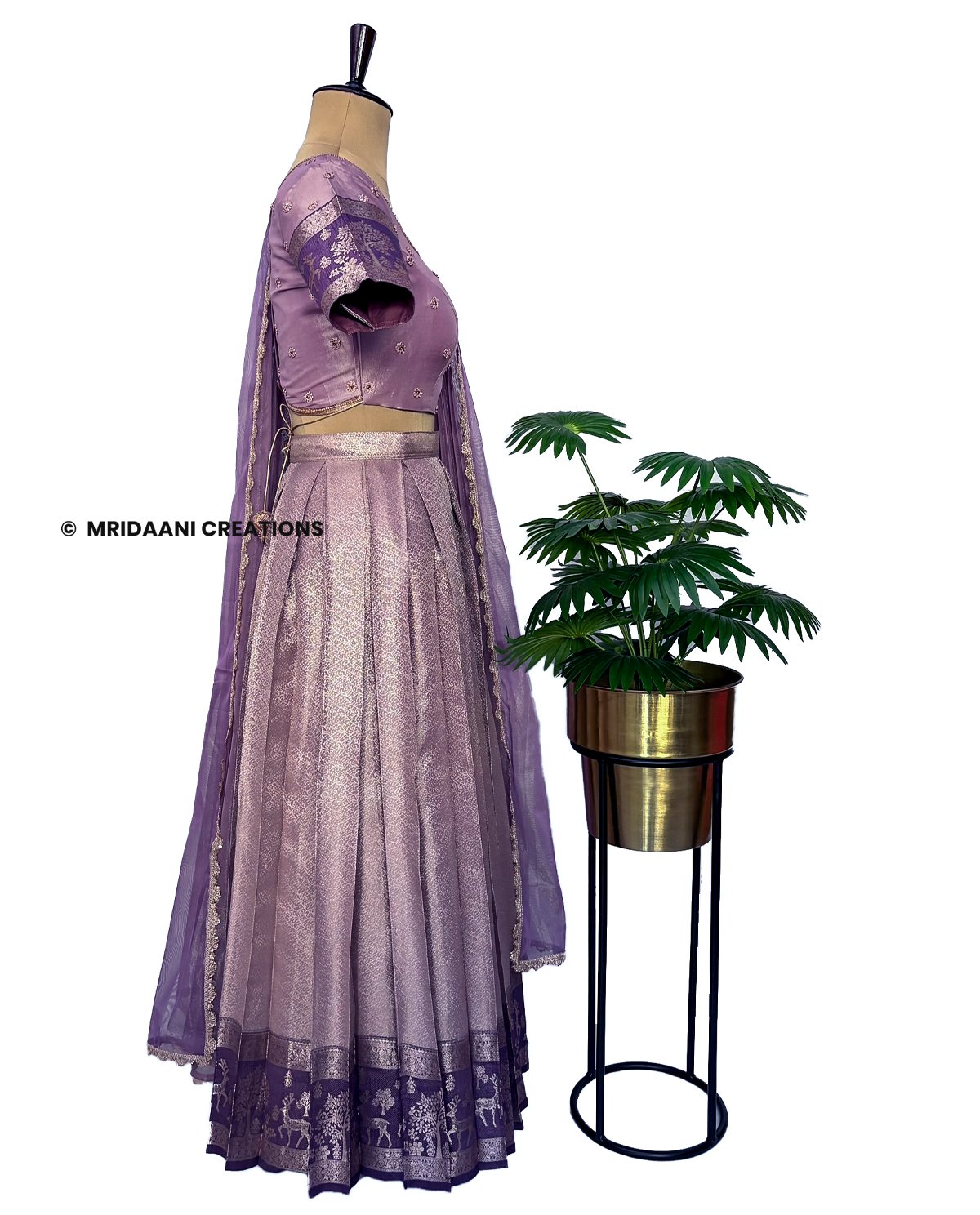 Mridaani designs this mesmerizing ethnic lehenga crafted in Kancheepuram Tissue Silk Material with delicate hand embroidery in various patterns, teaming it with matching blouse & a Dupatta.